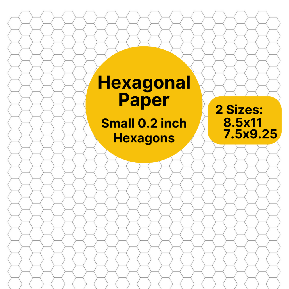 - Small Hexagonal paper in 2 sizes: 7.5” x 9.25” (with bleed) and 8.5” x 11” (with bleed). Small hexagons/hexes measure 0.2 inch.
