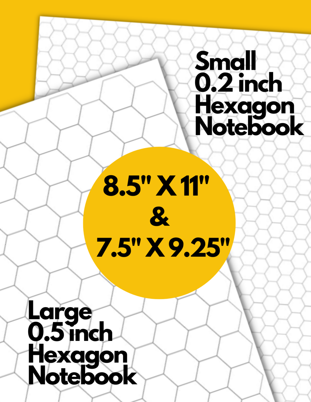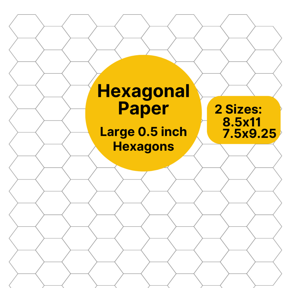 - Large Hexagonal paper in 2 sizes: 7.5” x 9.25” (with bleed) and 8.5” x 11” (with bleed). Large hexagons/hexes measure 0.5 inch.