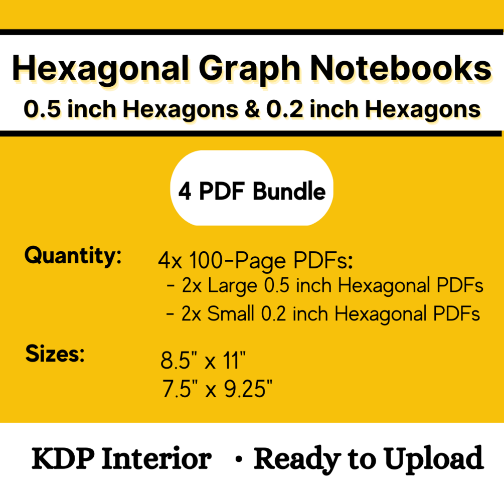 4 PDF Bundle READY-TO-UPLOAD Hexagonal Notebook PDF pages. Large 0.5 inch Hexagon and Small .02 Hexagon 100-Page PDF notebooks. Print your own notebook pages for personal or commercial use, ready for Amazon KDP uploading in print-quality. In sizes: 8.5" x 11" size (with bleed) and 7.5" x 9.25" (with bleed).